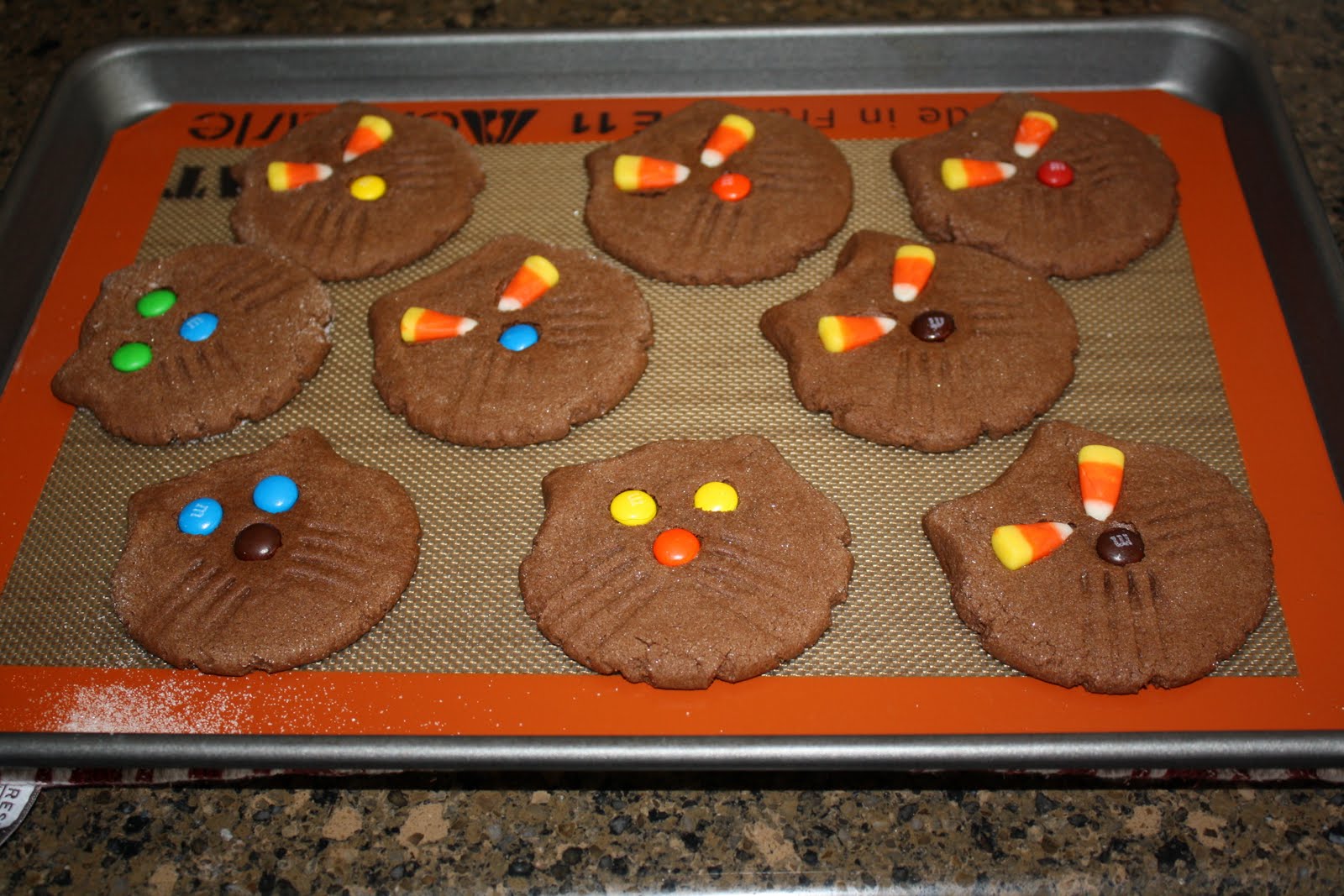 Once the cookies are out of the oven and still on the pan, press candy onto warm cookies to make the face. Mr. C helped during this step. We had to be very careful because of the hot pan.