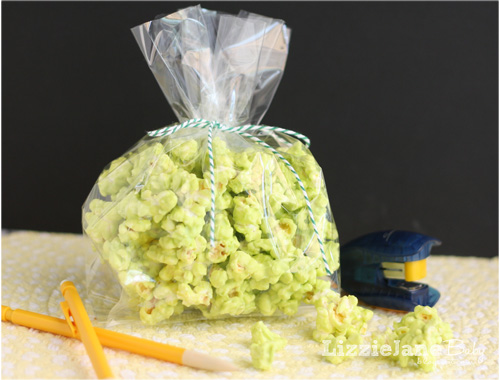 Once I put the popcorn in the bags, I tied them with some green bakers twine (you know, for the leaves) and attached my tags.