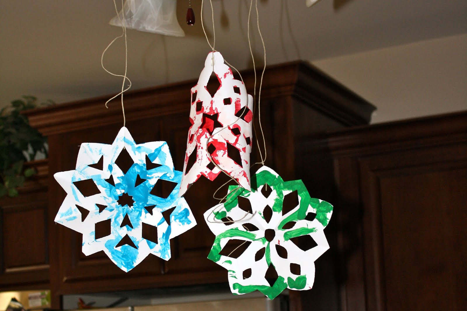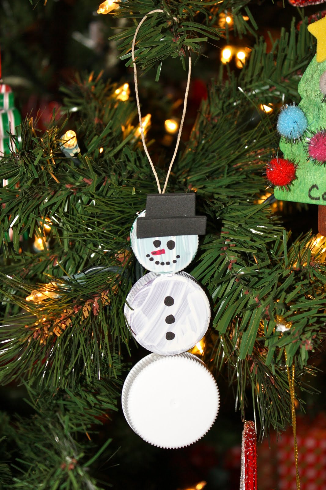 I found 3 varying sizes and we painted them white. I cut out a hat with some extra craft foam I had. I hot glued the bottle caps together, glued the hat on the top, some twine on the back for a hook and using sharpie markers, I made the eyes, nose, mouth and buttons. Mr. C loves hanging ornaments on the tree.