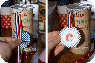 Once the outside was decorated, we covered them with mod podge to make them look finished.  Then I punched out some tags with the kids initials so we knew which one would be for which kid.  I punched a hole in the tab of the pop top and attached my tags with ribbon.