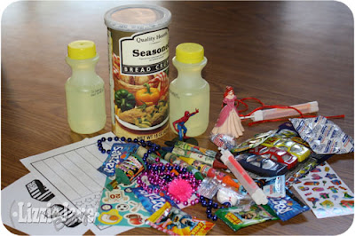 drink, fruit snacks, glow sticks, stickers, action figures, necklaces, candy, etc.