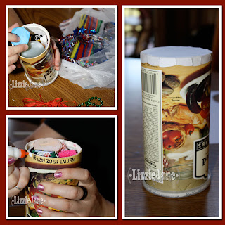 Using scrapbook paper, washi tape, glitter glue and mod podge, we decided on our designs, glued on our paper and decorated our canisters.