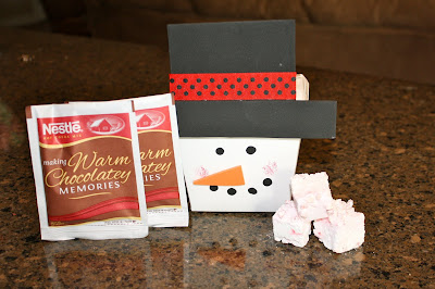 A couple packets of hot chocolate, some homemade peppermint marshmallows, a cute box that looks like a snowman and you have yourself a great neighbor gift!