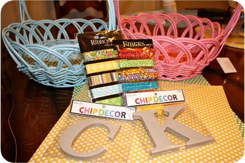 When I went back to Hobby Lobby to buy the baskets (there were only 3 of the smaller size left!!!), I decided I wanted to do a little something extra to the baskets. As I wandered the isles I found some chip board letters, some cute ribbon and fibers and paper to personalize my baskets.