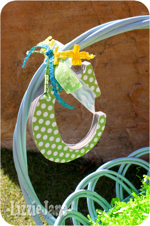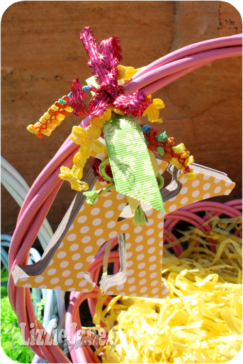 I traced both sides of the letters onto the back of paper, cut them out and mod podged them onto the letters. I attached a ribbon to the letter with hot glue and then attached it/tied it to the basket in the location I liked best. I added some hot glue to the handle so my ribbon would stay in place. Then I cut smaller strips of different ribbons and fibers and tied them all together and using a little more glue, I made sure everything was nice and secure.