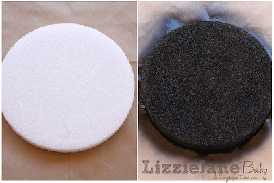I started out with a circular piece of styrofoam.  This one is almost 10 inches in diameter and almost 1 inch thick.  Using black spray paint, I sprayed the top and sides of the styrofoam.  (I made sure the spray paint said it would work on styrofoam.)