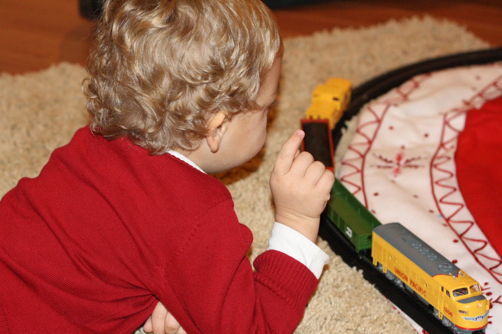 That is what Mr. C said as his Papa brought in a brand new train! My parents have always try to have a train around their tree. My grandpa had a train around his Christmas tree. So for that reason, when the oldest grandchild in a family turns 3, then they get a train to go around their Christmas tree. Papa came over earlier in the month and brought with him a special present for Mr. C. He absolutely loves it. He always wants to turn it on and has to show everyone that comes to our house.