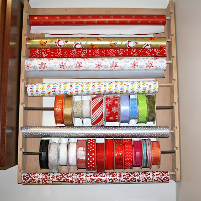I LOVE wrapping presents. And I LOVE CostCo wrapping paper and ribbon. I had so many that I had my husband build me a wrapping station! It looks similar to ones seen in scrapbook stores and pottery barn, but sturdy enough to hold the large rolls of paper and ribbon.