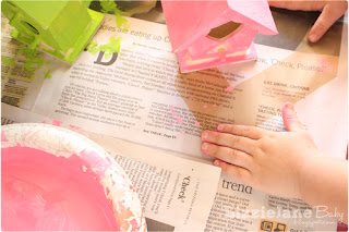 We brushed the Mod Podge Washout onto our roofs and then covered them with the scrapbook paper. I cut out some additional flowers and pasted them onto my house with the Mod Podge Washout. The kids painted on their Mod Podge Washout and layered on their “shingles”.