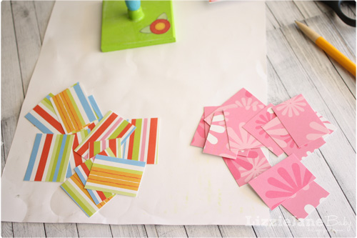 I took my bird house and laid the roof down on a piece of scrapbook paper, traced it and then cut it out. For the kids, I took scrapbook paper and cut them into squares/rectangles.