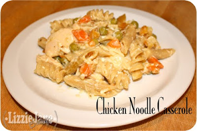 I came up with this recipe one night when looking up recipes on line. I found myself looking at tuna noodle casserole recipes at kraft foods. I like tuna noodle casserole, but knew my kids and hubby wouldn’t dig it.  But thought they just might go for chicken noodle casserole!