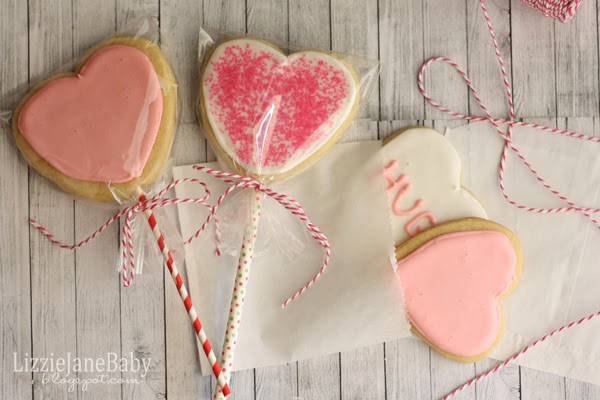 The last couple months I’ve been making sugar cookies with an amazing recipe that has turned out every time. I used to use the store bought dough and had the hardest time getting them to turn out. You can get the recipe and see the tutorial for the cookies and icing here. After I rolled out the dough and cut out my hearts, I inserted a cake pop stick into the bottom of the heart. I tried to make sure I put the stick as much in the center as possible. Then I baked the cookies at 350 degrees for 8 – 10 minutes.