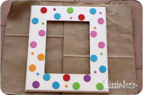 For my nieces frame, I knew I wanted to make polka dots.  I found in my crafting stash some foam shape stickers.  (I usually buy foam stickers when they are on clearance at JoAnns.)  I picked out the 2 sizes of circles I wanted to use, laid out my pattern and then peeled off the backs and stuck them to the frame.